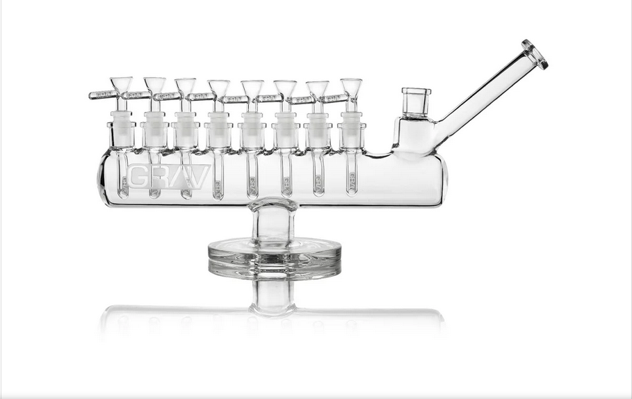 Push your limits, but don’t be afraid to tap out since this unique bong produces insane rips that’s equivalent to eight hits in one! Place the downstems and pack all eight of the included funnel-shaped bowls for an unforgettable smoking sesh with your friends. Everyone will want to test the power of the GRAV Menorah Bong for themselves and compete for the biggest rip of the night. This 14-inch long water bong is blown from high-quality transparent glass so you can watch all the smoke accumulate and bubbles form. To be extra sure that your giant bong rips don’t pull up any dirty water, the mouthpiece is offset and angled away from the water chamber. Get ready for a hit you’ll remember forever!