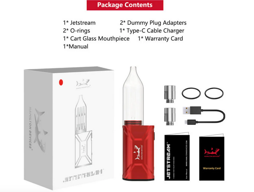 The Hamilton Jetstream is a revolutionary vaporizer that utilizes self propelling technology. No need to draw the vapor, the Jetstream fills the glass chamber so you can inhale at the push of a button.This power-packed vaporizer features three 510 thread cartridge slots, a self-propelling system, a switch activated 1800mAh battery, USB-C charger, variable voltage, and different airflow modes.You can also enjoy just one, or two cartridges at a time with the included dummy plugs.